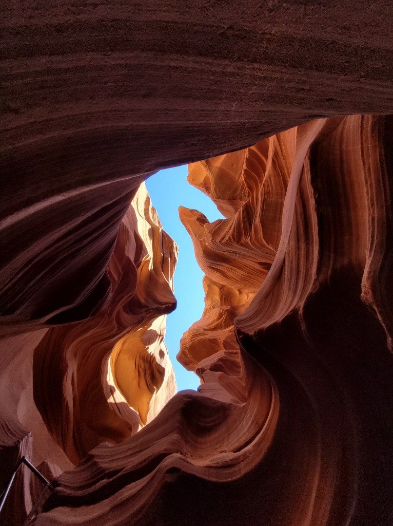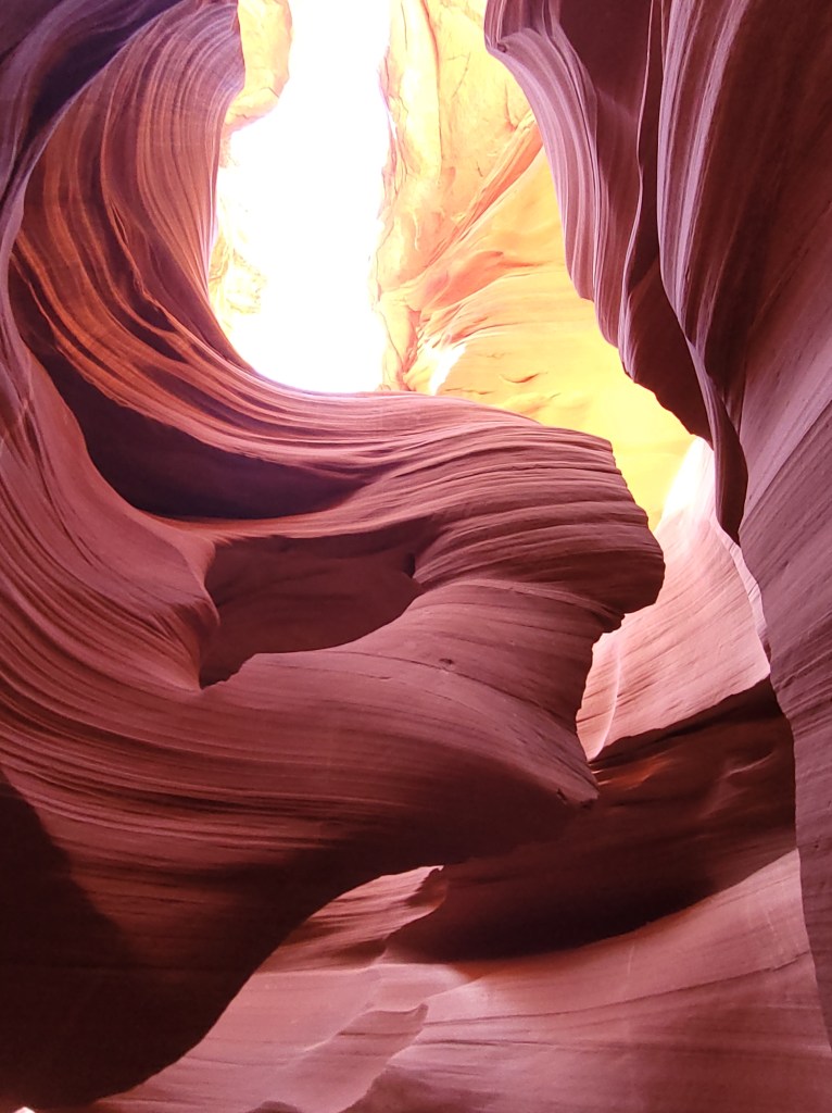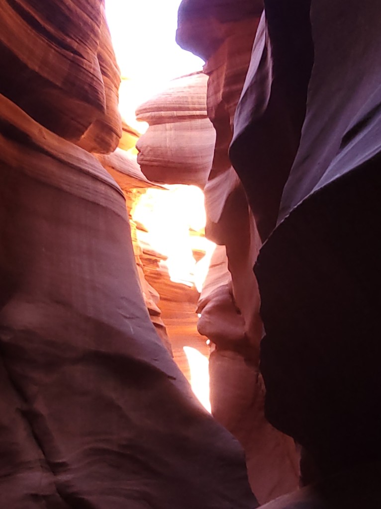 After breakfast, I headed to Antelope Canyon. The canyon was formed by the erosion of sandstone due to flash flooding. Water picks up speed and sand as it rushes through the narrow passageways. Over time the passageways eroded, deepening the corridors and smoothing the edges to form flowing shapes. There was a basketball sized boulder rammed into the canyon wall about 4 feet off the canyon floor. When we asked about it, our guide said they figure the boulder got rammed in during a flash flood.