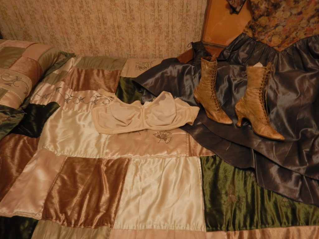 There were clothes laid out on one of the beds. The boots were tiny but the bra was huge. Priorities! Apparently, girls used to bind their feet, similar to Japanese women.