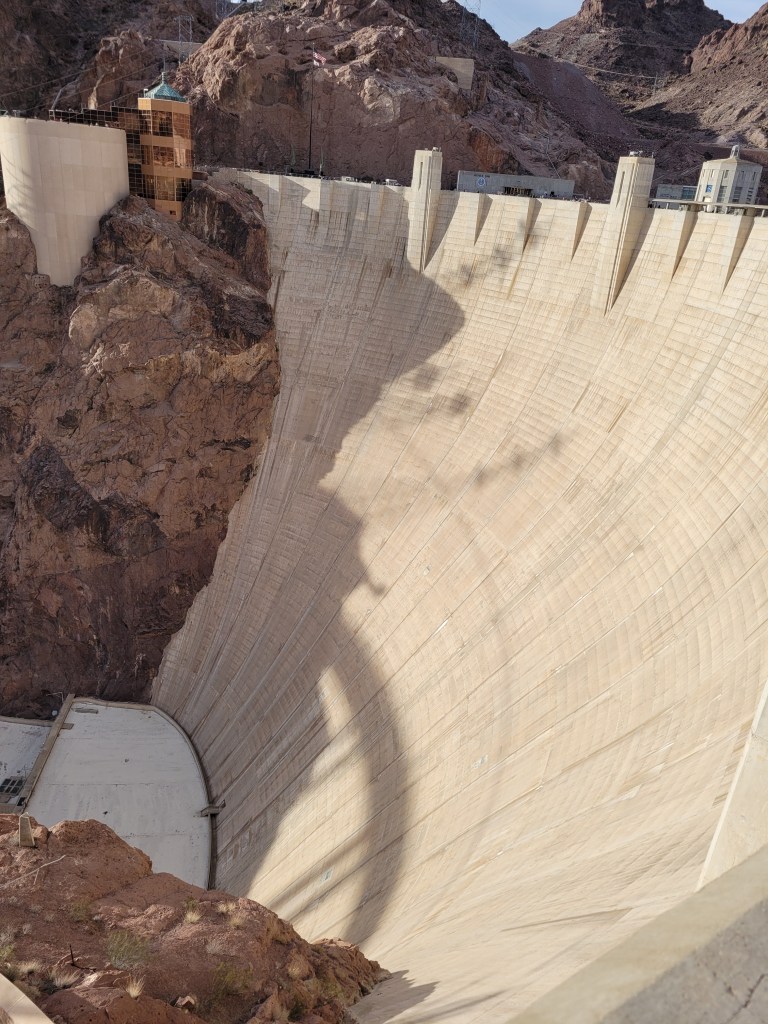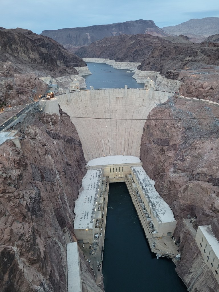 Lake Mead, technically the reservoir of Hoover Dam, covers 247 sq mi (640 sq km). It is currently at only 35% of its capacity, which is the lowest it has ever been. The last time it was this low was in 1937 when the water managers were still filling the reservoir and putting the finishing touches on the Dam. The white “bathtub ring” on the lake’s shores marks the drastic drop in water level. There are two overflow spillways, which have only been used twice; the first time was a test, the second time during a flood in 1983. The water has dropped 153 feet (46.6 m) since then. It now has 1071.5 feet (326.5 m) of water. The generators cannot work if it drops below 950 ft (289.5 m) and millions of people will be without a reliable source of water.