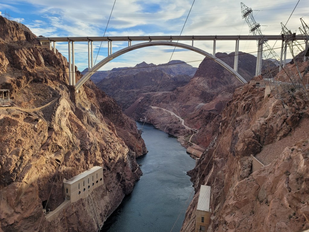 Traffic used to cross the Colorado River, between Arizona to Nevada, along hairpin turns and blind curves then along the rim of the Hoover Dam. The route was dangerous and inadequate for the rising volumes of traffic. As well as people rubber necking to have a look at the Dam. The decision was made in March 2001 to build a new bridge. The Sept 11 attacks of that year cemented the idea. It was just too risky to have some nut-job try to bomb the Dam. The Mike O’Callaghan-Pat Tillman Memorial Bridge was built 150 ft (460 m) downstream of Hoover Dam. It is a beautiful structure that has the widest concrete arch in the Western Hemisphere and is the world’s highest arch bridge. It was getting close to dark when I took the walk out onto the bridge. It was really windy and I was thankful for the high cement railing. I walked only half way and got a beautiful picture of Hoover Dam. By the time I walked back, the gates were closed and I was glad I parked across the road and was able to leave.