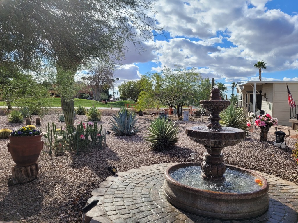 Jim and June have a park model home in Gold Canyon RV Resort. There are 750 homes in this particular resort, and they have the biggest and nicest site. Situated on a pie-shaped lot, it has a huge backyard. When they bought it the only landscaping was gravel. They have since planted many cacti and shrubs.