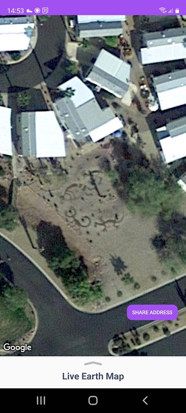 Jim also made a roadrunner, quail, Kokopelli, scorpion and lizard shapes out of coloured stones. He has plans for Wile E Coyote next. They are visible on Google Earth.