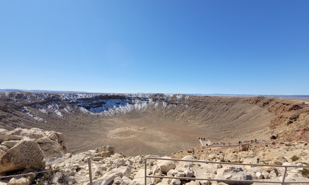 What is left is a hole a mile (1.6 km) across. The rim of the crater rises up from the desert floor. When the meteor hit it flipped the inside of the hole up and out. Think of a slow-motion picture of a stone hitting the water, and the splash up and outward. Bedrock was ejected and thrown 1-2 km away. The rim crest is being eroded by the winds across the desert. Also, the crater is being filled in by the same winds blowing sand in. Mining and NASA training only quickened the erosion. In 1963 the crater was 700 ft (213 m) deep. Today it is only 500 ft (168 m). All that said, it is still the best preserved meteor impact site in the world.