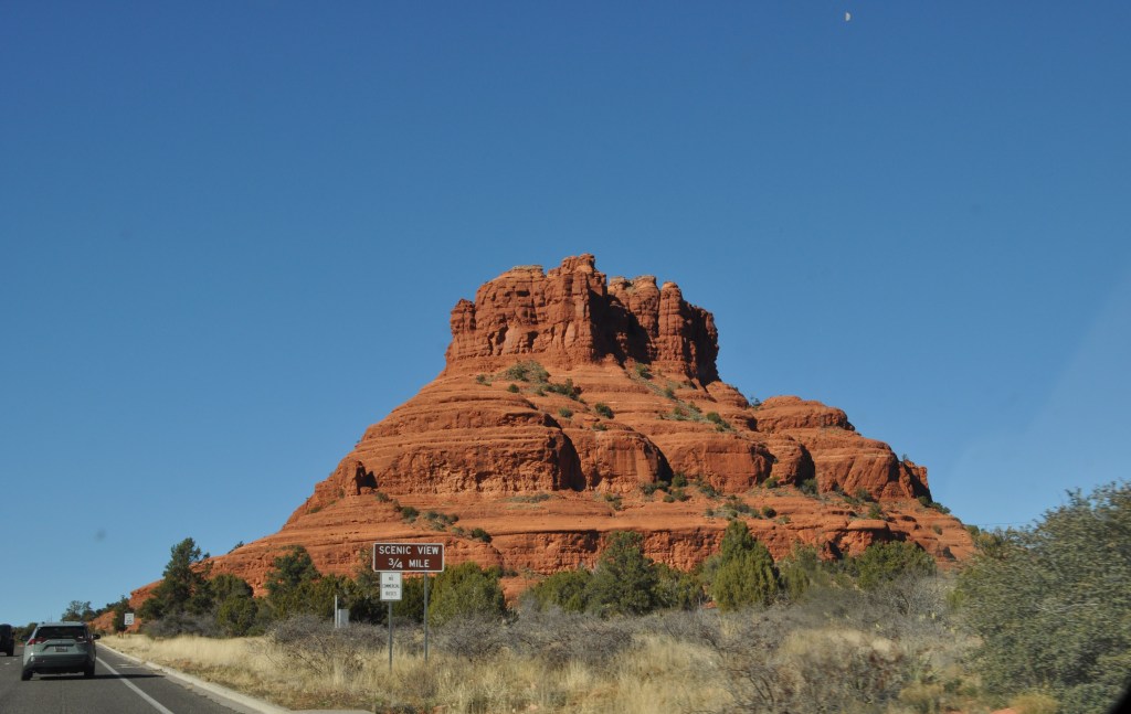 The next day (Saturday, Feb 19) Jim drove me to the airport, where I got a car and started my road trip of Arizona. I headed straight to Sedona. The first thing that struck me was the red sandstone formations. Bell Rock, in particular, is kind of hard to miss. It seemed like I was going to drive right into it as I passed through town. It is, as the name indicates, bell-shaped – wide at the bottom and tapering upwards to its 4919 foot summit. There was a scenic pull out where I stopped and had some pictures taken. I noted that there was a hiking trail, in hopes of coming back the next day. ( I never did.)