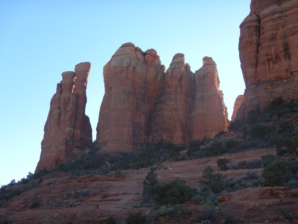 The formation that really caught my eye was Cathedral Rock. It has formations that rise up like the spires of a cathedral. I was more intrigued with climbing this one. The road leading up to the trailhead was blocked. The guard said there are only 50 parking spots for hundreds of people wanting to climb. I parked in a church parking lot and walked the mile up to the trailhead. It was getting close to sunset and the guide said this was a good hike and view for this time of day.