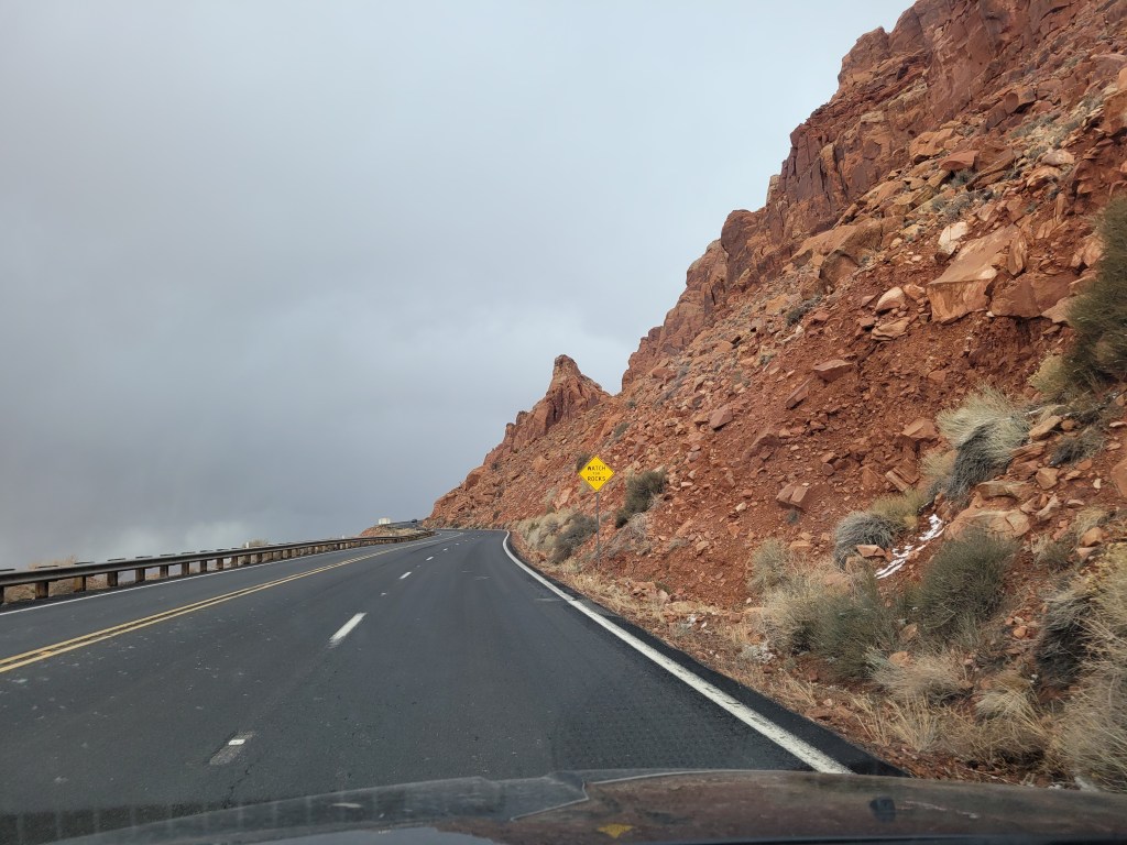 But with approximately 6-8 inches of heavy wet snow recently pushed off the highway and a temperature of minus 3 C, I kept on driving. I stopped for a short break at Jacob Lake Inn where I met a girl who assured me I was on the right road. As I drove away, I noticed a gate that said Grand Canyon North Rim – Closed. I met some people who left Nevada earlier that day and they said there was at least a foot of snow on the roads. I was lucky I waited until the snowplows had cleared them. I am also lucky I did not go to Butte Canyon. I’d still be stuck there! With a total of 192 miles (309 km) on mostly wet switchback roads at an elevation of 7000 ft (2134 m), I was ready for a hotel room.