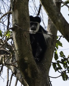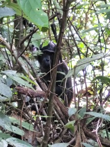 Most of the chimps were in the trees – or maybe it seemed that way because they were easier to see and hear. We all got sore necks from looking up. The chimps sit VERY high in the treetops, eating and spitting. When they decide to leave the treetops, they swing from branch to branch, on their long arms, and within a few seconds they are on the ground where they silently vanish into the brush.
