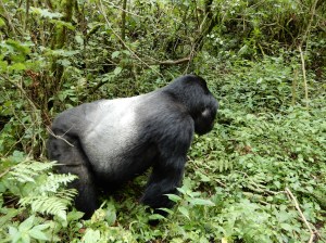 We were broken up into small groups, given walking sticks and off we went. The sticks came in VERY handy when climbing some of the hills. We started off on a trail for about 90 minutes. The rangers keep in touch with the trackers as to where the gorillas are. Our ranger suddenly said that our gorilla family had been spotted and we were leaving the trail in order to take a shortcut. The shortcut consisted of a cow-path trail down a 45-degree embankment that dropped 50 meters. We were hanging on to branches and roots to keep from losing control. Our shortcut took another 90 minutes.