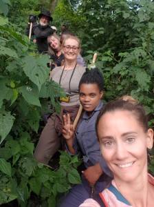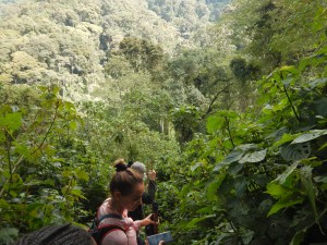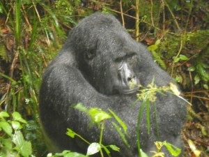 Then it started to rain. There is a reason they call it a rain-forest – it POURED. Gorillas don’t like the rain. They sat huddled, hugging themselves and looking very miserable. We tried to take more pictures, but it was raining so hard our cameras wouldn’t focus and our cell phones got wet. Too soon our hour was up and we had to head back.