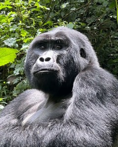 I saw one moving and started to video. Suddenly a 240 kg silverback came out and sat right in front of us – 2 meters away. the Ranger made us move 10 meters away. We were surrounded by them. The Silverback, mom and baby on one side. Mom and juvenile on the other.