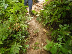 The trail was bad enough when it was dry, now it was slippery wet. We had to climb that very steep hill we came down on. We were slipping and sliding, hanging on to branches and trying to gain a foothold on roots. Sara commented that if the person in front slips, we would all go down like a string of dominoes. It made me step off the trail slightly whenever we had to wait for the line to move.