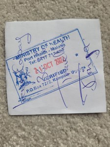 First, we had to show our passport, yellow fever certificate and proof of 2 covid vaccines to an agent. He gave us a scrap piece of paper (there was writing on the back) with our name, our temperature and his signature. We took that piece of paper to another office where they gave it an official stamp. We then took that official stamp to another office, across the street, to get our passports scanned and receive an exit stamp from Kenya. Then we had to go back across the street to get a photocopy of our passport and East Africa visa. The photocopy was one dollar. Then we had to go back across the street to submit the photocopy and get our entry stamp into Uganda. The entire process took us a little over an hour.