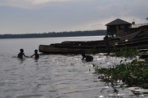That evening, after our rafters returned, a group of us went on a boat cruise to the head of the Nile. We went to a fishing village on the edge of Jinja and on the bank of Lake Victoria, where we were to board our boat. The village was a shanty town. It was very poor. The buildings were made of whatever scraps of building material they could find. The street was dirt. The kids shabbily dressed. Some kids were playing in the water, naked. Some kids were hauling dirt. BUT all the kids were laughing and waving to us.