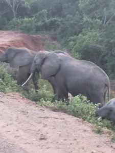 Vivian was, again, our guide. On the way, just a few kilometres from the lodge we saw five huge elephants grazing in the ditch beside the road. Further on, we saw a tower of giraffes. Once in the Park, it got dark quickly. Vivian was standing at the back of the jeep, shining her huge spotlight back and forth in hopes of seeing an animal.