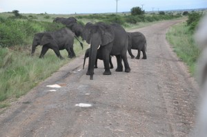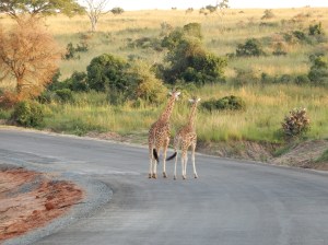 As we headed back to the lodge we saw more animals on the highway than we did in the Park. The reason is that rain washes off the highway and causes the grass to grow in the ditches. The highway also retains heat. Combined, this causes animals to converge there to eat. I am used to watching for deer or gophers on the roads in Canada. Here, we saw elephants, giraffes, hippos, a jackal and a hyena. Hippos and elephants are huge! Much heavier than our jeep! And they kind of take up the entire road. When the hyena jumped out of the ditch, my Canadian mind was thinking “Coyote?” too small. “Bear?” wrong shape. “What the hell IS that?” All in a nanosecond.