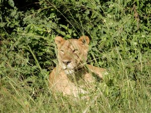 a pregnant lioness with a radio collar. She was resting under some bushes. A fellow in the jeep behind us got out of his jeep for a better picture. She perked up really fast when he got out. NEVER get out of your jeep unless instructed to.