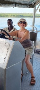 We stopped at the entrance to Murchison Falls National Park for a boxed lunch and to get our permit to enter the Park. There was a small gift shop located there, as well. Kevin didn’t want Sue to linger after lunch for fear that she would go crazy shopping in the curio shop. Just then Patrick said we were ready to go. Kevin held out his hand to help Sue down the steps. She said “Why are you holding out your hand? You never hold out your hand.” We all burst out laughing and had to explain that he wanted her OUT of the shop.