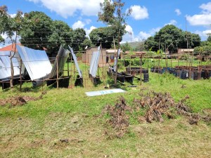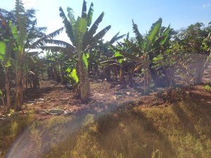 We saw lots of bananas growing. Bananas produce fruit 14 months after planting, then the plant dies. It is cut off and from the stump, a new plant grows. Every part of the banana plant is used. The leaves serve as plates or as wrapping for cooking food. The bark is used as a water pipe. The middle of the stock is used for cow food. Nothing is wasted.