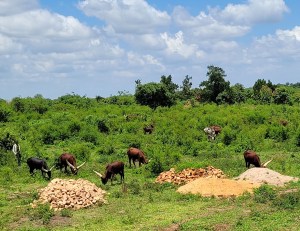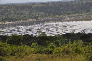 We stopped for a bathroom break at a small market. They were conveniently located on a high hill overlooking a volcanic crater lake where salt is harvested. Lake Katwe?? Water drains in but cannot drain out. Evaporation leaves behind a salt solution. Harvesting salt is not easy, in fact, it is dangerous. The salty is water is so toxic that men wear condoms so as not to get their private parts affected. Women put flour in their private parts for the same reason. The infertility rates are high in this area. The cleaner salt is sold as table salt, the muddier salt is used to cure meat.