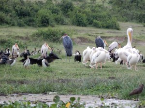 We went on another game drive, this time to Queen Elizabeth National Park. While we were waiting for our entry permit I was talking to a fellow about the weaver birds. These cute little yellow birds build their nest upside down. Well, the males build the nest – in hopes of attracting a female. If she likes the nest, fine. If she doesn’t like it, he tosses it to the ground and builds another one. As the fellow told me, if he built a house for a lady and she didn’t like it, he was more likely to toss her out!