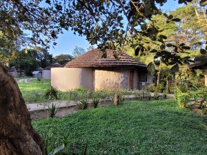 We arrived at Sambiya Park Lodge. It was another beautiful lodge rated on Booking.com at $172/night. We were taken down a path to a large round fire pit that was surrounded by a larger round sitting area and offered freshly squeezed watermelon juice. Yummy. Off to the side was a suspension bridge over a small valley. The Lodge was built to resemble the traditional round mud huts with thatched roofs, that we saw so many of along the road.