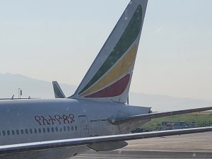 Deb and Sue went in search of their husbands. In the meantime, we had to go through immigration again. More waiting. Alas, no exit stamp for Ethiopia. Then another luggage scan, shoes off, full body scan. What could we have smuggled in during that 50-yard walk from the last scanner? Never mind! We are past security! We looked for our gate on the screen and off we went. WAIT! Another luggage scan, shoes off, full body scan. We all started to laugh. This was beyond ridiculous!