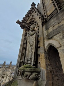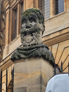 I backtracked to the cathedral entrance at Tom Quad. Here I saw the shrine of St. Frideswide, the Patron Saint of Oxford. She was a Saxon Princess and had vowed to become a nun, however, the king was determined to marry her. She fled and prayed to God for protection while she hid in a tree. God struck the King blind. He realized the error of his ways and asked Frideswide for forgiveness. She forgave him and his sight was magically restored. She began to have a reputation as a healer. Her shrine is the oldest monument in the Cathedral. It is covered in naturalistic foliage carvings – sinful stuff in those days. Perhaps because of this or because it was Catholic, it was badly damaged during the English Reformation in 1538. Living up to her healer reputation, the carving of her face among the foliage she hid in was not damaged.